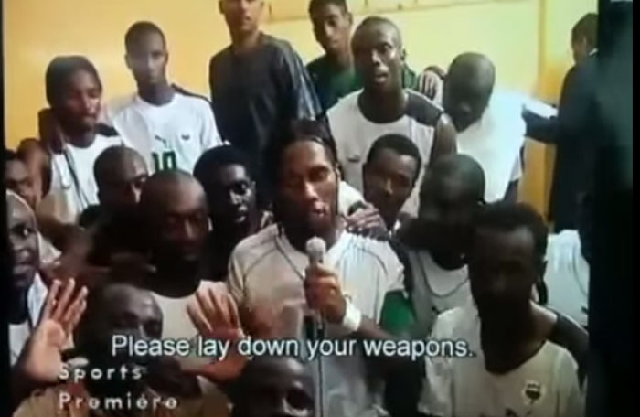 Le conflit dans le pays avait atteint un sommet sans précédent et toute tentative d’y mettre fin avait échoué misérablement. Toutefois en 2005 la Côte d'Ivoire se qualifie pour la première fois à la coupe du Monde , pour l’histoire de ce pays, le président et ses coéquipiers se mettent à genoux en direct à la télé et supplient les belligérants de déposer les armes pour le bien des populations.